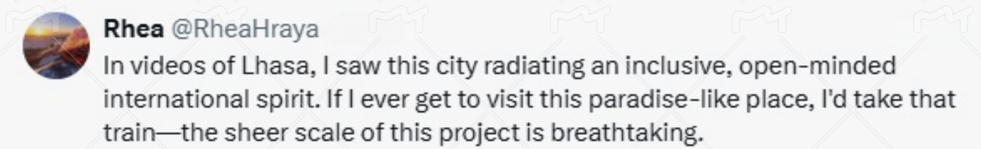 網(wǎng)友@Rhea表示,“在拉薩的視頻中,我看到這座城市散發(fā)著包容、開放的國際精神。如果我有機(jī)會參觀這個天堂般的地方,我會坐那列火車——這個項目(青藏鐵路)的規(guī)模令人嘆為觀止?!?/p>