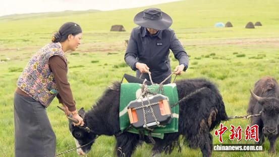 浙江援藏人員給牧民放牧的牦牛綁上“移動式光儲一體微電站”設(shè)備。毛一豐 供圖