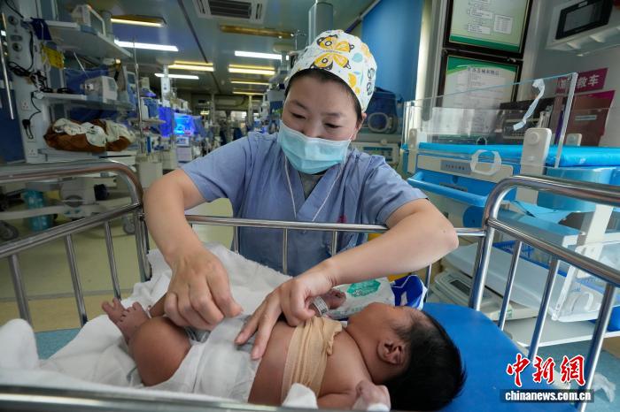 9月5日,西藏阜康醫(yī)院新生兒科內(nèi),護(hù)士正在安撫新生兒。西藏自治區(qū)成立60周年西藏婦女兒童事業(yè)發(fā)展情況發(fā)布會(huì)5日在拉薩召開(kāi)。發(fā)布會(huì)介紹,西藏孕產(chǎn)婦死亡率、嬰兒死亡率分別降至34.94/10萬(wàn)、4.32‰,60年來(lái),西藏婦女兒童衛(wèi)生健康水平顯著提高。中新社記者 李林 攝