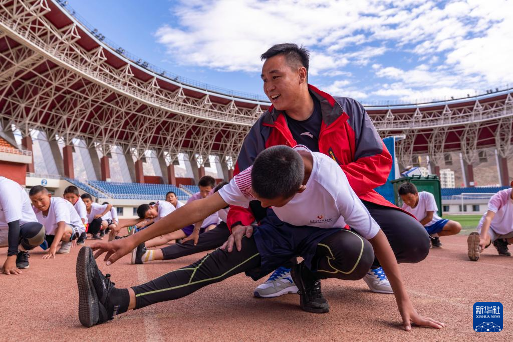 資料圖片:2019年6月22日,摔跤奧運(yùn)冠軍張小平和競(jìng)走奧運(yùn)冠軍王麗萍在西藏自治區(qū)拉薩市文化體育中心為拉薩市業(yè)余體校的小運(yùn)動(dòng)員們上了一節(jié)訓(xùn)練課。圖為拳擊奧運(yùn)冠軍張小平正在指導(dǎo)小運(yùn)動(dòng)員的壓腿動(dòng)作。新華社記者 孫非 攝