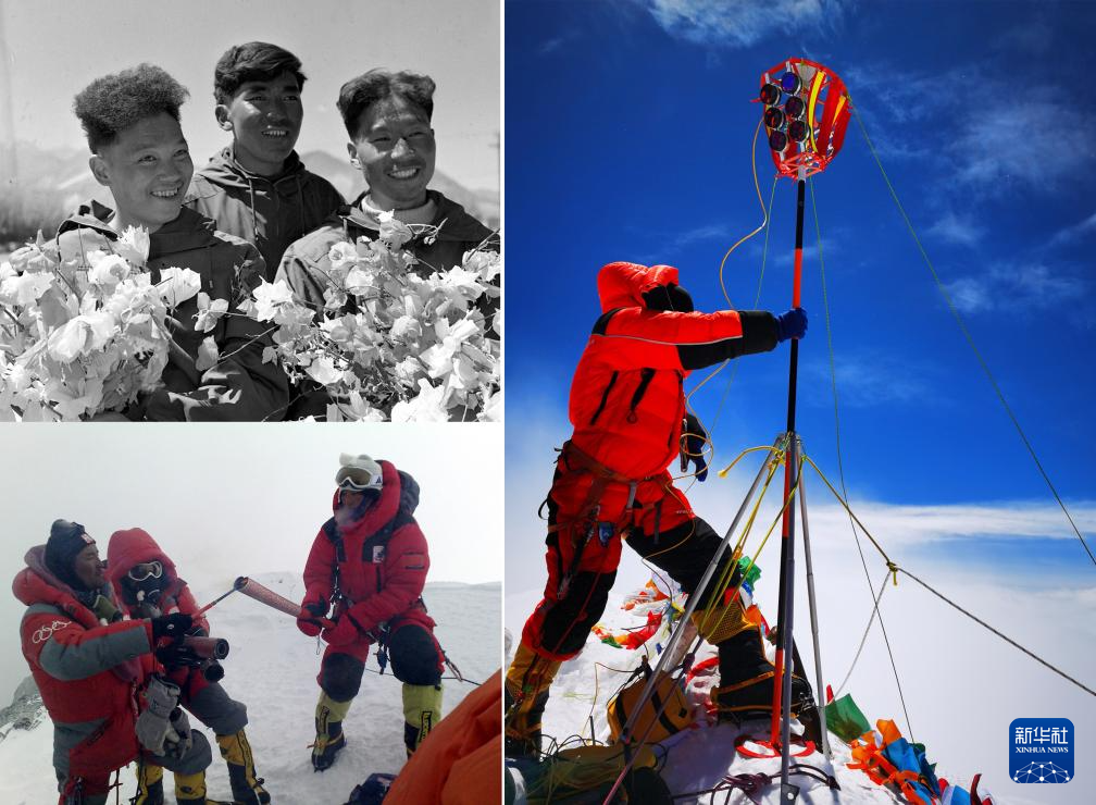 拼版照片:左上圖為1960年5月登上珠穆朗瑪峰頂?shù)闹袊巧疥?duì)隊(duì)員王富洲(右)、貢布(中)和屈銀華(資料照片 新華社發(fā));左下圖為2008年5月8日,北京奧運(yùn)圣火珠峰傳遞登山隊(duì)隊(duì)員羅布占堆(左)點(diǎn)燃第一棒火炬手吉吉手中的“祥云”火炬(新華社發(fā));右圖為2020珠峰高程測(cè)量登山隊(duì)隊(duì)員在珠穆朗瑪峰峰頂開展測(cè)量工作(2020年5月27日新華社特約記者扎西次仁攝)。新華社發(fā)
