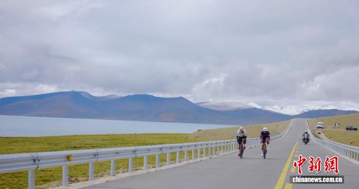 圖為9月7日,參賽選手在海拔超過5000米的西藏普莫雍措湖畔騎行。(浪卡子縣融媒體中心供圖)