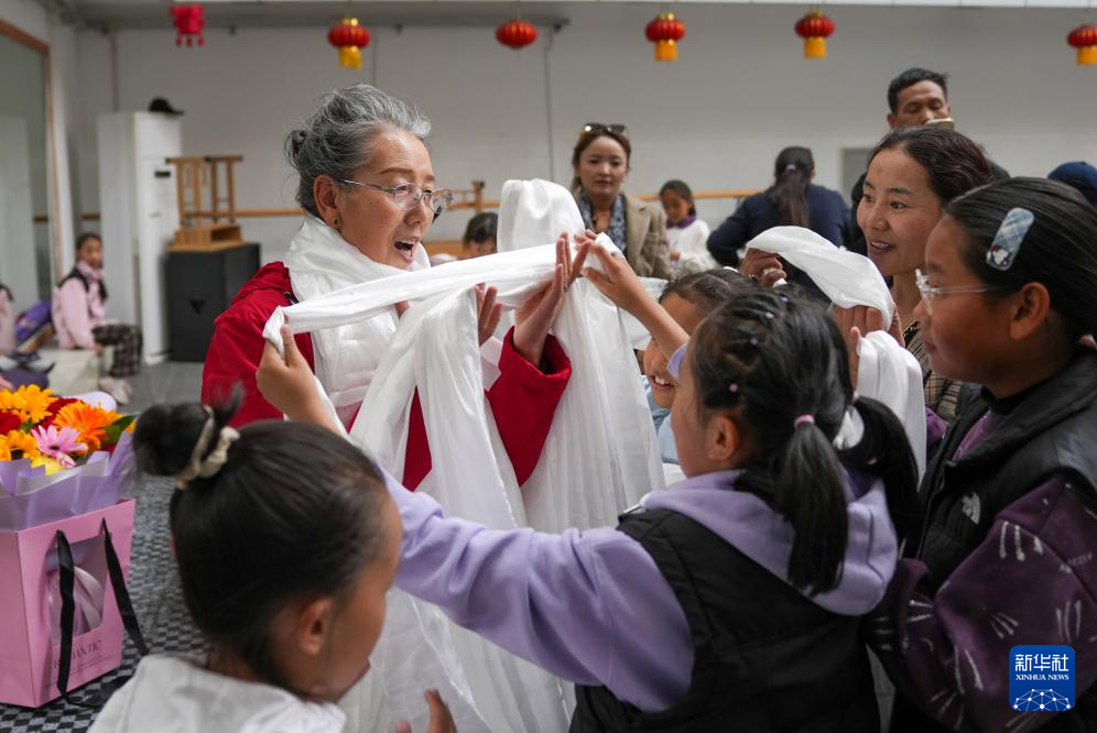 9月14日,孩子們給巴桑老師獻(xiàn)上哈達(dá),送上遲到的教師節(jié)祝福。新華社記者 晉美多吉 攝