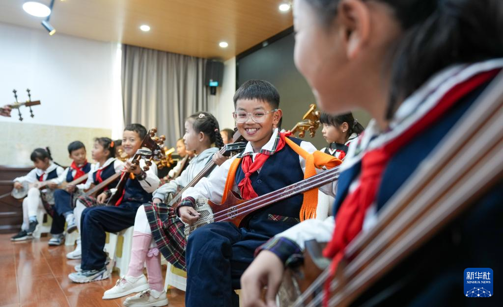 9月11日,在拉薩市實(shí)驗(yàn)小學(xué),孩子們在彈奏扎念琴。新華社記者 晉美多吉 攝