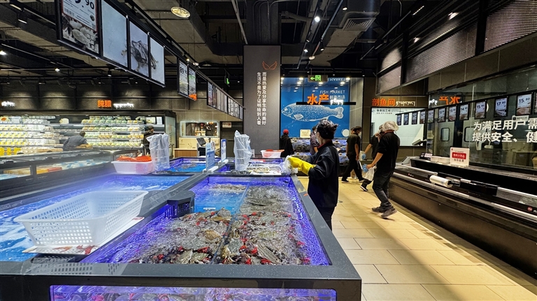 肉禽區(qū)在保留原有優(yōu)質(zhì)商品基礎(chǔ)上,新增黑豬系列冷鮮肉、品牌冷鮮進(jìn)口牛肉、原切牛排等高品質(zhì)商品,同時(shí)引入藏香豬冷鮮肉、牦牛肉、本地藏雞蛋等特色商品。海鮮區(qū)域在保留本地淡水魚(yú)的基礎(chǔ)上,加大明蝦、鮑魚(yú)、扇貝等大海鮮的占比,同時(shí)帝王蟹、波龍、面包蟹、珍寶蟹組成“進(jìn)口四大金剛”,滿足顧客對(duì)高端海鮮的需求。針對(duì)季節(jié)需求,還推出優(yōu)質(zhì)大閘蟹等時(shí)令商品,滿足消費(fèi)者對(duì)優(yōu)質(zhì)蛋白的需求。