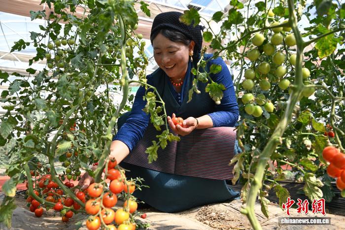 圖為當(dāng)?shù)毓と嗽谀窆たh現(xiàn)代化農(nóng)業(yè)示范園里采摘圣女果。中新社記者 貢嘎來(lái)松 攝