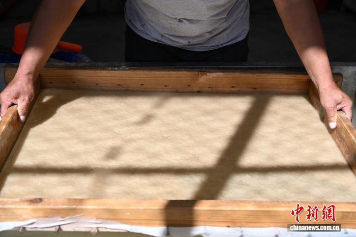 10月16日,“共建中華民族共同體書(shū)寫(xiě)美麗西藏新篇章——魅力新拉薩 幸福高原城”暨中央媒體和網(wǎng)絡(luò)名人采風(fēng)活動(dòng)走進(jìn)西藏自治區(qū)拉薩市尼木縣尼木雪拉藏紙農(nóng)牧民專(zhuān)業(yè)合作社采訪中國(guó)國(guó)家級(jí)非物質(zhì)文化遺產(chǎn)代表性項(xiàng)目藏族造紙技藝。據(jù)悉,藏紙傳承至今已有1300多年歷史,雪拉藏紙作為西藏三大藏紙之一,其特殊原料配方造就“蟲(chóng)不蛀、鼠不咬、不腐不變色”的特性,用它印制的文史經(jīng)典千余年完好如初。圖為尼木雪拉藏紙農(nóng)牧民專(zhuān)業(yè)合作社員工在制作藏紙。中新社記者 貢嘎來(lái)松 攝
