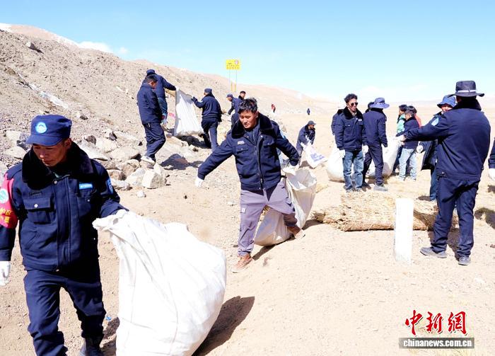 圖為參加專項(xiàng)清潔行動(dòng)的專業(yè)管護(hù)人員撿拾G216國道兩側(cè)垃圾。索朗仁青 供圖