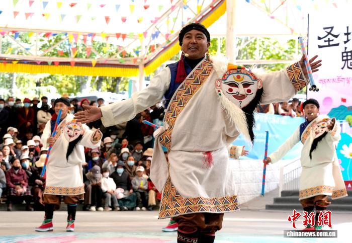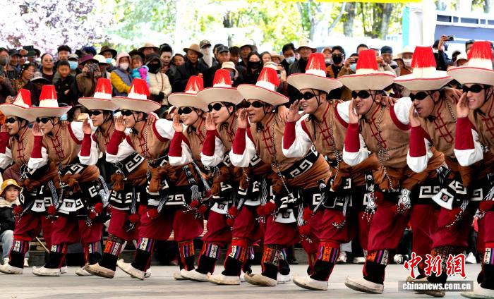10月19日,“格?;ū崩_市第六屆縣(區(qū))藝術(shù)團(tuán)文藝調(diào)演頒獎活動在布達(dá)拉宮腳下的宗角祿康公園舉行。現(xiàn)場,拉薩市各縣(區(qū))藝術(shù)團(tuán)帶來精彩節(jié)目。圖為文藝調(diào)演頒獎活動上的文藝表演。中新社記者 李林 攝