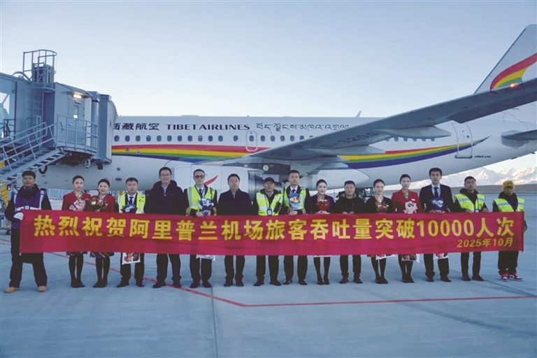 10月20日,西藏航空TV9705航班平穩(wěn)降落在阿里普蘭機場,作為阿里普蘭機場2025年第10000名旅客,乘客果果在工作人員的掌聲中走下飛機,接受機場工作人員敬獻的哈達和鮮花。這一刻,是阿里普蘭機場實現年旅客吞吐量“從千到萬”的歷史性跨越。