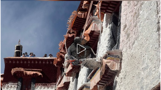 布達(dá)拉宮迎來了一年一度的“煥新”計(jì)劃,來自布達(dá)拉宮管理處的專業(yè)人員,與當(dāng)?shù)孛癖?、熱心志愿者們共同投入到這場(chǎng)“年度美容”工程中,為這座擁有千年歷史的古老宮殿披上潔白莊嚴(yán)的“新衣”。參與涂墻的民眾,身上、頭發(fā)上都沾滿了白色的涂料,仿佛落了一層細(xì)雪。同時(shí),一桶桶涂料被有序地傳送并潑灑在墻面上,布達(dá)拉宮這座屹立千年的宮殿在陽(yáng)光下也愈發(fā)明亮。除此之外,大昭寺、色拉寺等大大小小的寺廟及民居的房屋也會(huì)開始粉刷,這一工作將在藏歷九月二十二日之前完成。