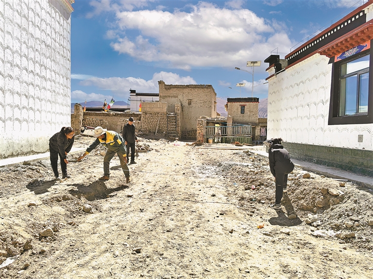 拉孜縣查務(wù)鄉(xiāng)那布西村干部、駐村工作隊(duì)隊(duì)員測(cè)量重建后的村道距離,初步確定群眾圍墻修建范圍。
