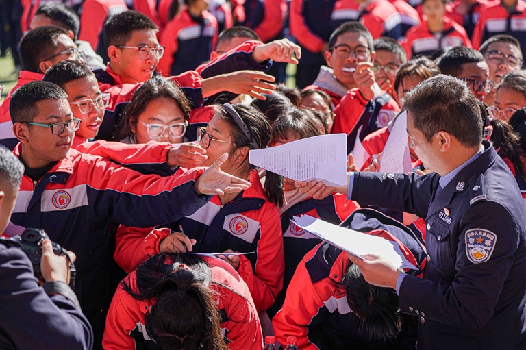 西藏“開學(xué)第一課”網(wǎng)絡(luò)普法進(jìn)校園活動中,民警為學(xué)生發(fā)放普法宣傳知識手冊。記者 貢曲羅杰 攝