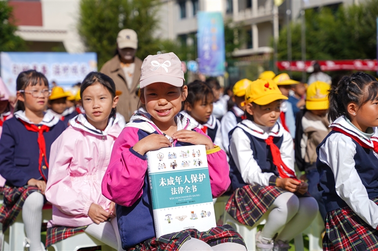 西藏自治區(qū)2025年“送法進(jìn)校園”系列普法宣傳示范活動中,孩子們領(lǐng)到《未成年人保護(hù)法律全書》。記者 貢曲羅杰 攝