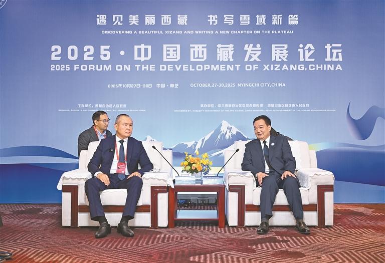 10月28日,自治區(qū)黨委書記王君正在林芝會(huì)見(jiàn)參加2025·中國(guó)西藏發(fā)展論壇的外國(guó)政要和駐華使節(jié)。這是王君正會(huì)見(jiàn)吉爾吉斯共和國(guó)總統(tǒng)駐伊塞克湖州全權(quán)代表熱季根諾夫。本報(bào)記者 旦增西旦 攝