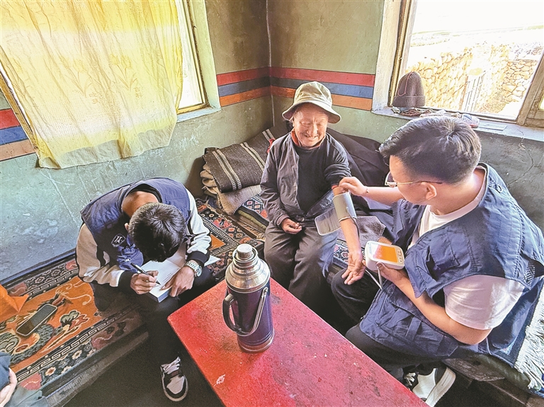 圖為當雄縣羊八井鎮(zhèn)民政服務站工作人員入戶為特供分散戶老人做基礎生命體征檢查。