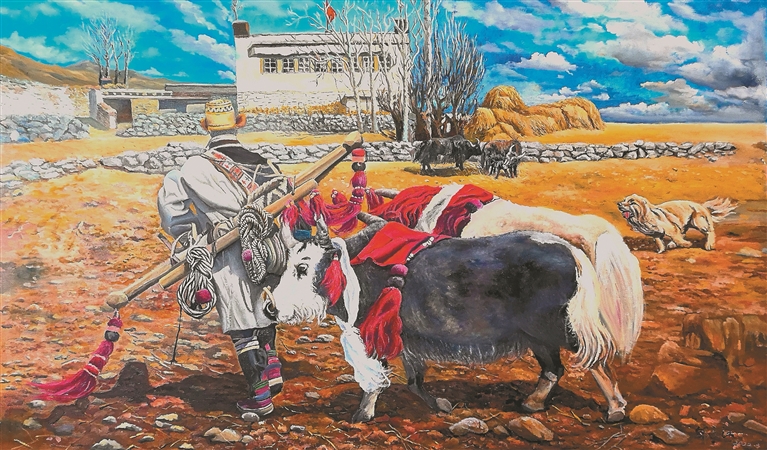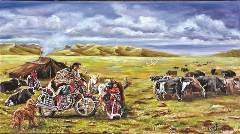 在鄒文江的畫筆下,《草原新景》展現(xiàn)的是牧民騎著摩托車放牧,藍天白云下,現(xiàn)代化的交通工具與遠處的雪山相映成趣;《記憶——紀(jì)念修建川藏公路》描繪的是十八軍戰(zhàn)士修建川藏公路時的險峻場景,崇山峻嶺間,奔騰不息的怒江咆哮而過,正在修路的十八軍戰(zhàn)士顯得渺小又偉大;《邊陲人家》記錄的是一戶邊境牧民家庭悠閑放牧的生活場景……他的作品中,既有圣潔的雪山、遼闊的草原、成群的牦牛,也有現(xiàn)代化的學(xué)校、醫(yī)院、民居和牧民的笑容。
