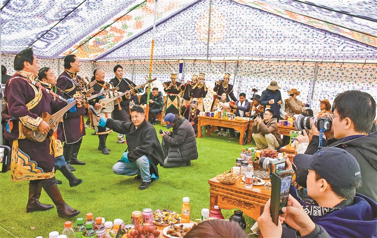 “我們的烤藏香豬外皮酥脆、肉質(zhì)鮮嫩,來(lái)嘗嘗吧?!薄笆侂u、石鍋雞,先喝湯、再吃雞。”“青稞酥油茶,免費(fèi)品嘗啦?!薄げ夹履甑目鞓?lè)勁兒在于這一聲聲吆喝聲中,在于熱鬧的氛圍,在于每一個(gè)人滿足的笑臉。