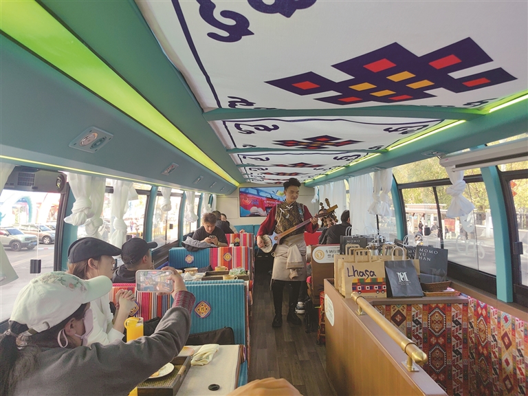 游客筱康從成都專程來到拉薩,通過網(wǎng)絡(luò)平臺了解到這輛觀光巴士后,毫不猶豫地購買車票前來體驗。坐上巴士,窗外的風(fēng)景如同一幅流動的畫卷,隨著車輪的前行緩緩展開。八廓商城的熱鬧繁華、布達(dá)拉宮的雄偉壯觀、拉薩河的寧靜秀麗、遠(yuǎn)處落日的余暉灑在大地上,川流不息的人群穿梭其中,側(cè)耳傾聽是城市的低語,煙火氣縈繞良久。而低頭品嘗著現(xiàn)做的美食,熱氣氤氳間,他深深感受到了這座城市的溫柔與魅力。筱康興奮地說:“我覺得這次體驗感簡直太棒了!觀光巴士沿著拉薩主城區(qū)的路線行駛,沿途可以看到大昭寺、布達(dá)拉宮、羅布林卡、拉薩河、南山公園等眾多美麗的風(fēng)景。更重要的是,車上還可以品嘗到現(xiàn)做的美食,喝著甜茶,欣賞著特色節(jié)目,還能親眼看到工作人員制作酥油茶、甜茶的過程,品嘗青稞爆米花,這種全新的體驗真的非常值得推薦!”