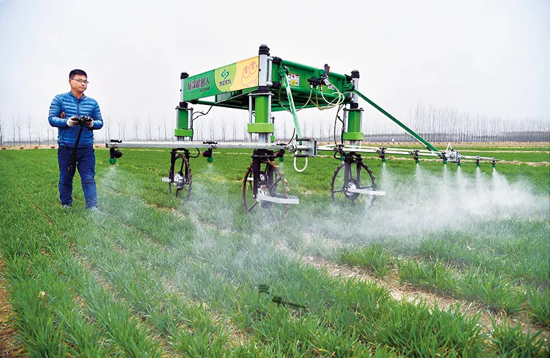 實施鄉(xiāng)村振興戰(zhàn)略,必須破除人才瓶頸制約。記者在山東壽光、滕州、鄒平等地看到,很多外出求學(xué)、打工、創(chuàng)業(yè)多年的年輕人,帶著新的理念和技術(shù)回到農(nóng)村,成為希望田野上的職業(yè)農(nóng)民。圖為2018年3月20日,鄒平縣明集鎮(zhèn)年輕的職業(yè)農(nóng)民在操作植保機器人噴施農(nóng)藥。 新華社記者 郭緒雷/攝
