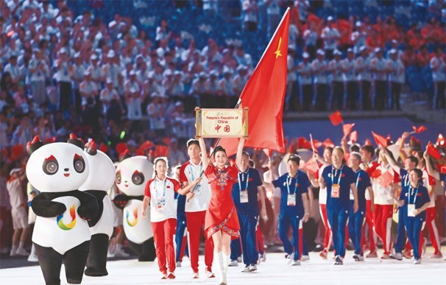 2023年7月28日,第31屆世界大學(xué)生夏季運動會開幕式在成都東安湖體育公園主體育場舉行。圖為中國大學(xué)生體育代表團(tuán)在開幕式上入場。 新華社記者 王曦/攝