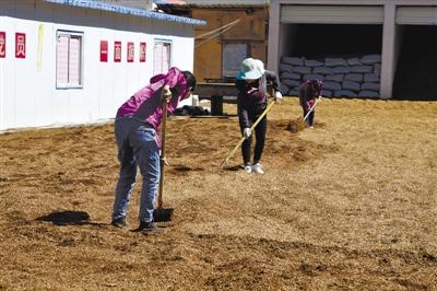 位于林芝市米林縣米林鎮(zhèn)雪卡村的米林鎮(zhèn)紅太陽(yáng)科技示范家庭農(nóng)場(chǎng),創(chuàng)建于2012年9月,38個(gè)溫室大棚里,有15個(gè)大棚用于種植靈芝。在尼瑪和米林縣米林鎮(zhèn)扶貧信息員程攀的帶領(lǐng)下,記者首先看到的是3個(gè)女工正在翻曬木屑,這是靈芝菌菌袋中最關(guān)鍵的“載體”——青崗木木屑。“青岡木木屑通過(guò)高溫蒸煮、殺毒殺菌等程序后再種下野外收集來(lái)的孢子粉,移到右邊的房間里培育?!背膛收f(shuō)。