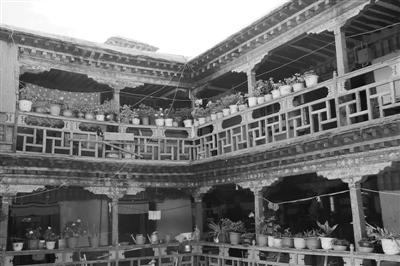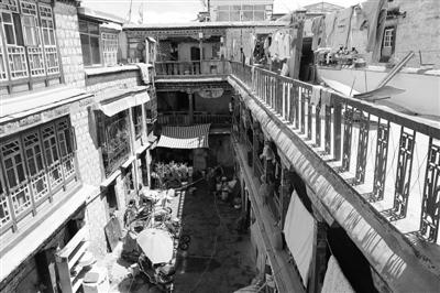 拉薩塊石碉樓四合院形成時間較早,現(xiàn)存建筑均有100多年的歷史,分布在著名的八廓古城,一般為貴族府邸和商賈宅院。由主樓和附樓圍合庭院構(gòu)成居住單元,花崗石塊石砌建筑體和木柱共同承重的石木結(jié)構(gòu)體系。“拉薩地處拉薩河谷,地勢平坦,石材資源豐富,為塊石碉樓四合院提供了先天條件?!蔽鞑毓沤▽<荫R驍利說。