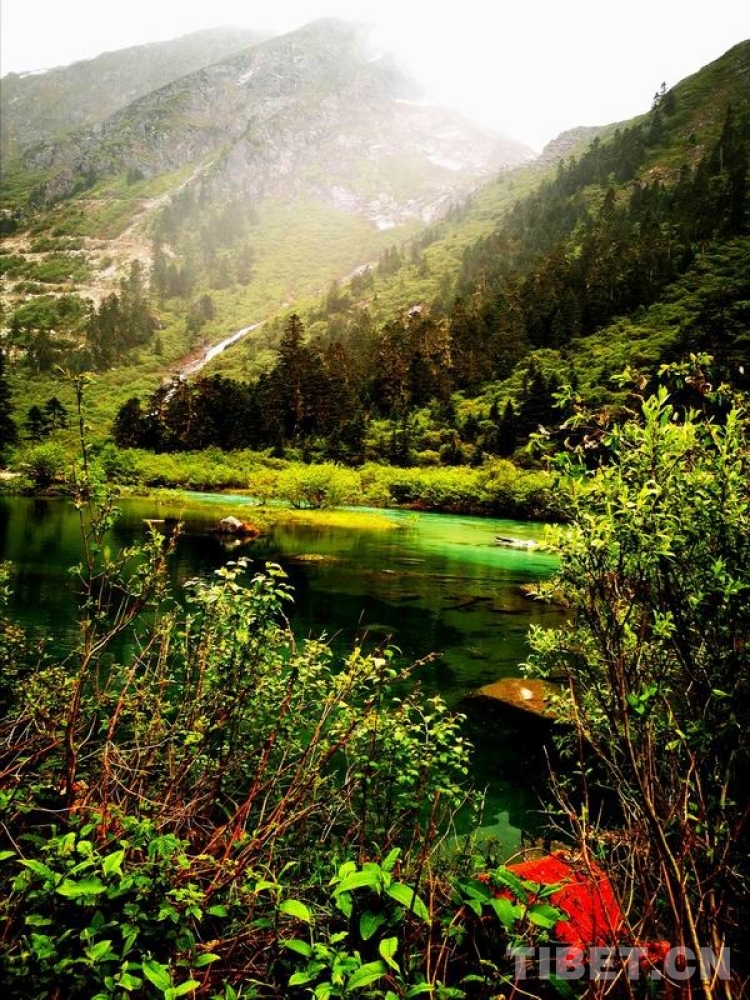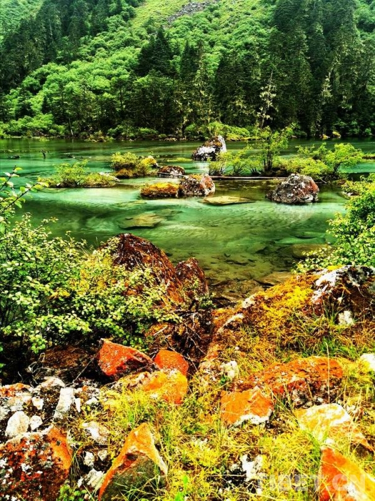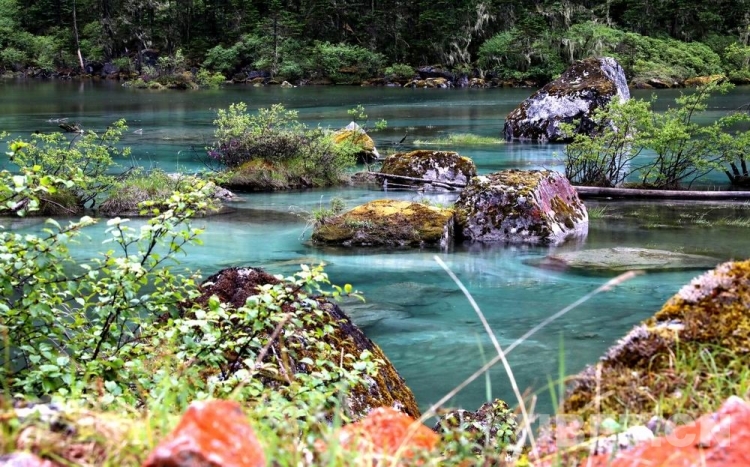 少女般的冰湖,藏于青山綠樹(shù)中,伏于深林密草內(nèi),異常迷人。站在不同的視角看冰湖,同一水域,卻有不同的顏色,綠中透著藍(lán),藍(lán)中泛著橙、橙中映著赤、赤中蘊(yùn)著黃,斑斕奪目,攝人心魄。湖水周圍的花草樹(shù)木長(zhǎng)得異常茂盛,五光十色的倒影使湖水更加瑰麗。