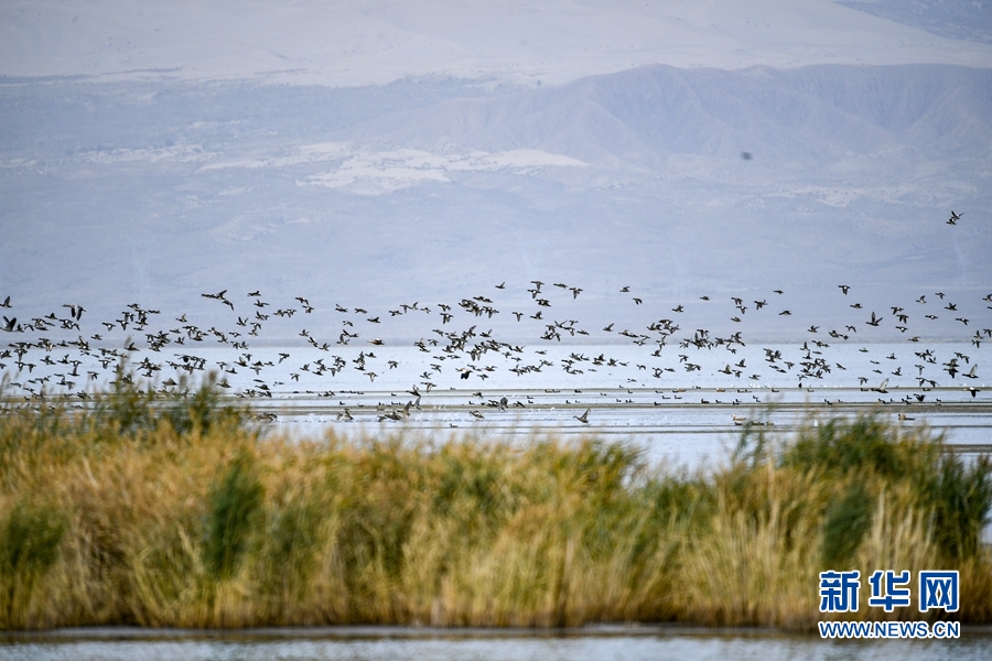 成群的赤麻鴨在海西州烏蘭縣都蘭湖國(guó)家濕地公園飛翔盤(pán)旋。