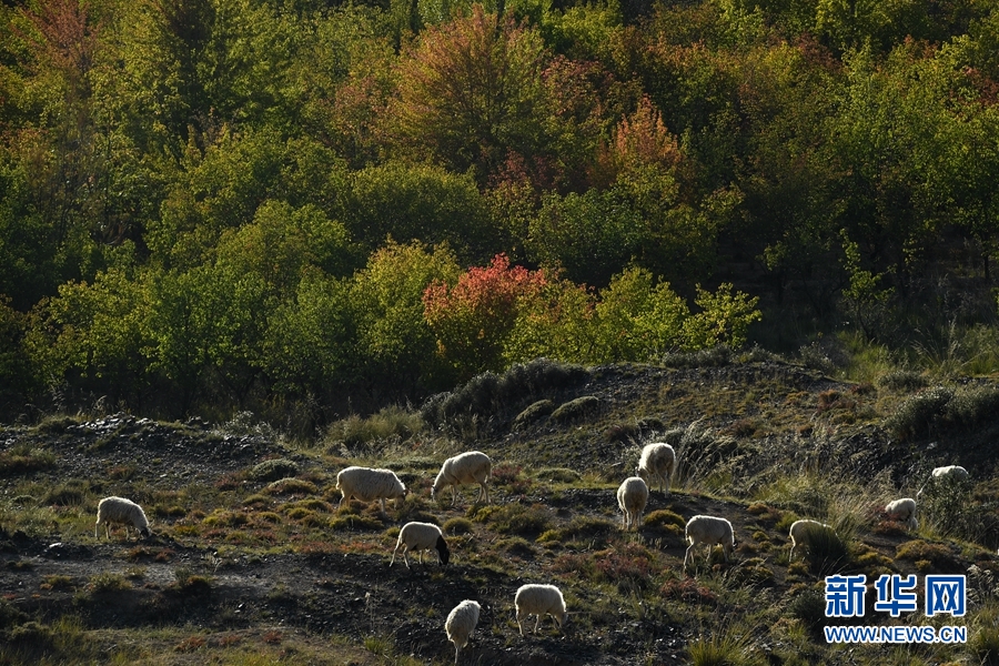 龍羊峽庫(kù)區(qū),層林盡染,羊群在山坡上低頭吃草。