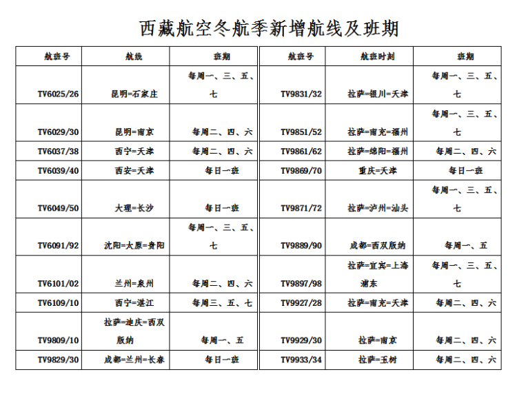 中國(guó)西藏網(wǎng)訊 10月25日,西藏航空將正式進(jìn)入冬航季。在今年的冬航季,西藏航空在原有航線網(wǎng)絡(luò)布局的基礎(chǔ)上進(jìn)行了優(yōu)化調(diào)整,新開拉薩—南京、拉薩—宜賓—上海浦東、成都—西雙版納等20條國(guó)內(nèi)航線(新開航線及班期詳見表格)。