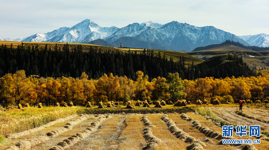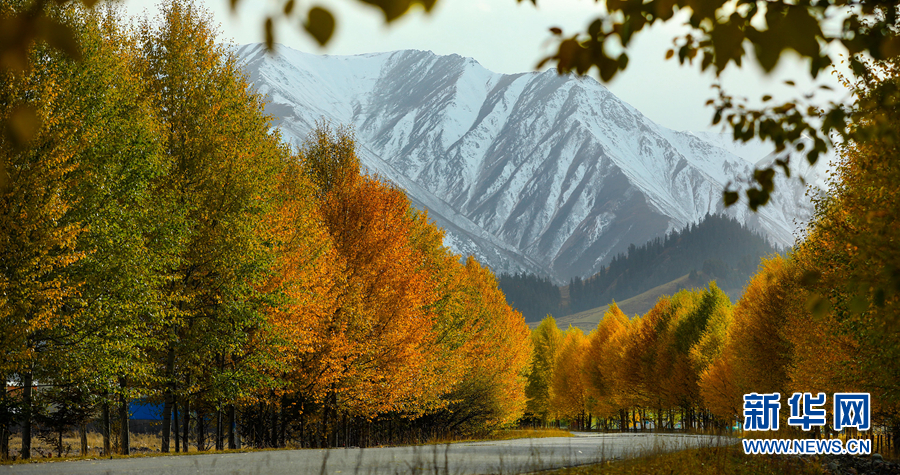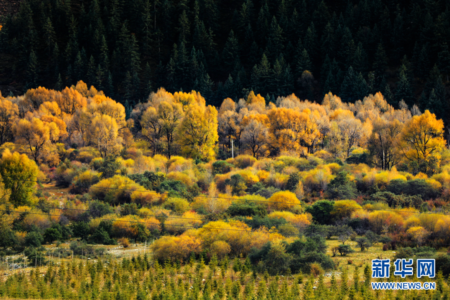 金黃色的樹(shù)木與遠(yuǎn)山交相輝映,處處呈現(xiàn)出醉人的美景。新華網(wǎng) 蘇金元攝