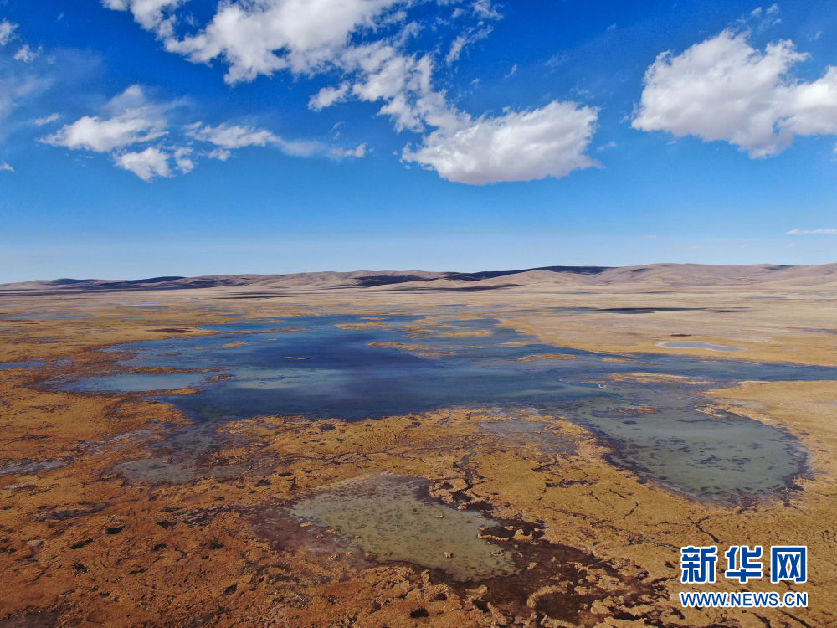 這是10月30日在青海省果洛藏族自治州瑪多縣境內(nèi)拍攝的一處濕地(無人機(jī)照片)。新華社記者 張龍 攝
