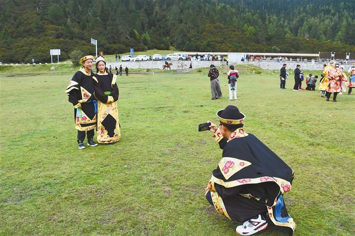 圖為來自廣東的游客在魯朗身著工布服飾拍照留念。 本報記者 張猛 攝