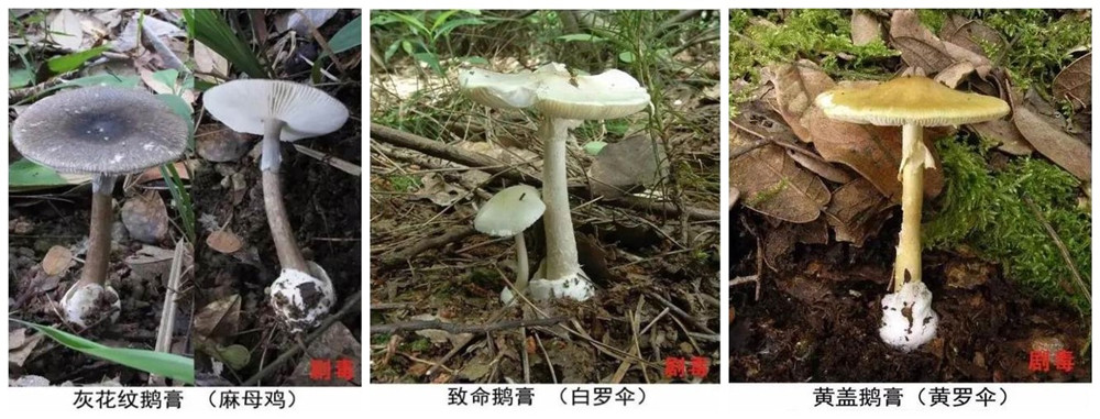 圖為劇毒鵝膏菌中的部分成員 圖片來(lái)源:云南省衛(wèi)生健康委員會(huì)、云南省疾病預(yù)防控制中心發(fā)布海報(bào)截圖拼接