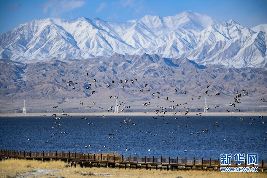 天光云影,百鳥(niǎo)翔集,一群赤麻鴨在都蘭湖國(guó)家濕地公園上空飛翔。(11月21日攝)新華網(wǎng) 潘彬彬攝