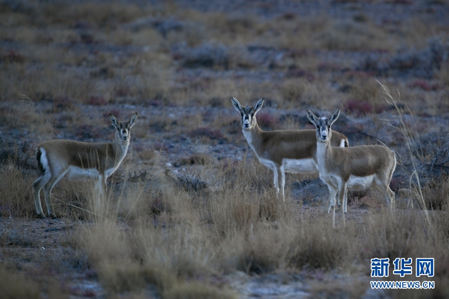 四只鵝喉羚在都蘭湖國(guó)家濕地公園內(nèi)活動(dòng)。(11月21日攝)新華網(wǎng) 潘彬彬攝