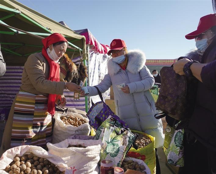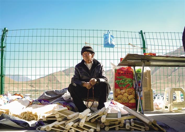 “這個小包好精致,太好看了。”旦增的攤前圍繞著一群人。“那個最小號的包還有嗎?”“不好意思,都賣完了,您看看其他型號的吧?!眮碜粤种ナ欣士h的旦增已經(jīng)是第四次參加物資交流會了,此次物資交流會他不僅帶來了核桃、辣椒、蘋果等當?shù)靥厣a(chǎn)品,還帶來了牦牛皮制作的手工包。