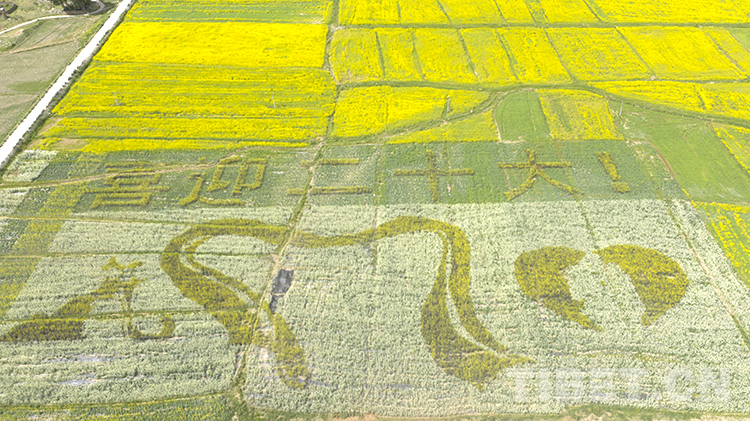 值得一提的是,在扎西崗鄉(xiāng)主會(huì)場,當(dāng)?shù)貙⒒牡刂匦麻_墾,安排種植了油菜花大地景觀。不同品種、不同顏色的油菜花海為背景的種植,從空中俯瞰形成了“喜迎二十大”“松贊故里 幸福墨竹”字樣和松贊干布、文成公主、哈達(dá)、愛心等圖樣,表達(dá)當(dāng)?shù)厝罕娤灿h的二十大的美好祝福。