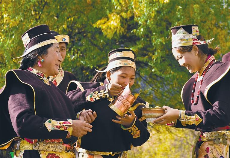 林芝市巴宜區(qū)布久鄉(xiāng)朵當(dāng)村村民身著節(jié)日盛裝在田間起舞。謝筱純 王珊 張猛 攝