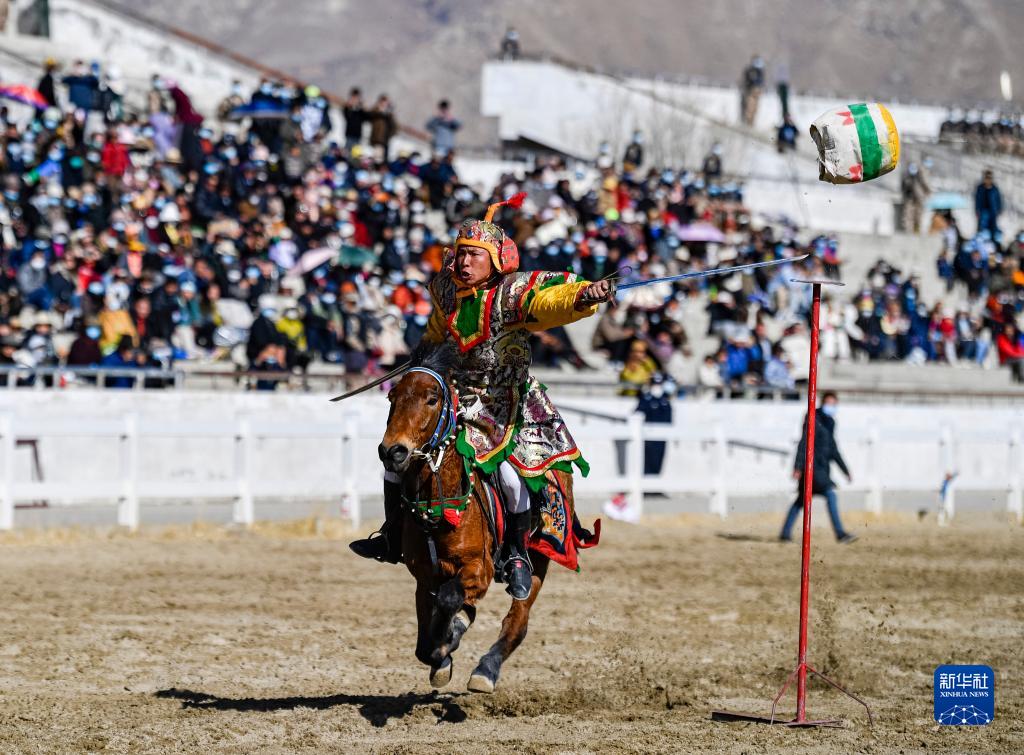 每年藏歷新年初三,在拉薩賽馬場舉辦馬術表演已成為當?shù)貞c祝新年的傳統(tǒng),深受廣大群眾喜愛。騎手們英姿颯爽,為觀眾們帶來騎馬拾哈達、騎馬射箭等精彩表演。