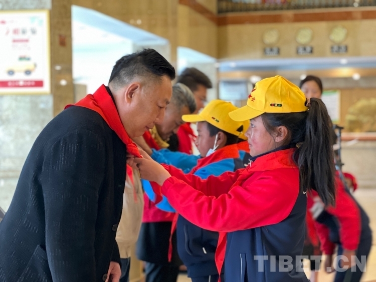 圖為學(xué)生代表向相關(guān)領(lǐng)導(dǎo)佩戴紅領(lǐng)巾 攝影:德吉卓瑪