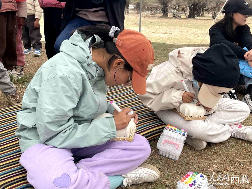 圖為活動現(xiàn)場,小朋友在牛皮船上進(jìn)行繪畫。人民網(wǎng) 郝潔攝
