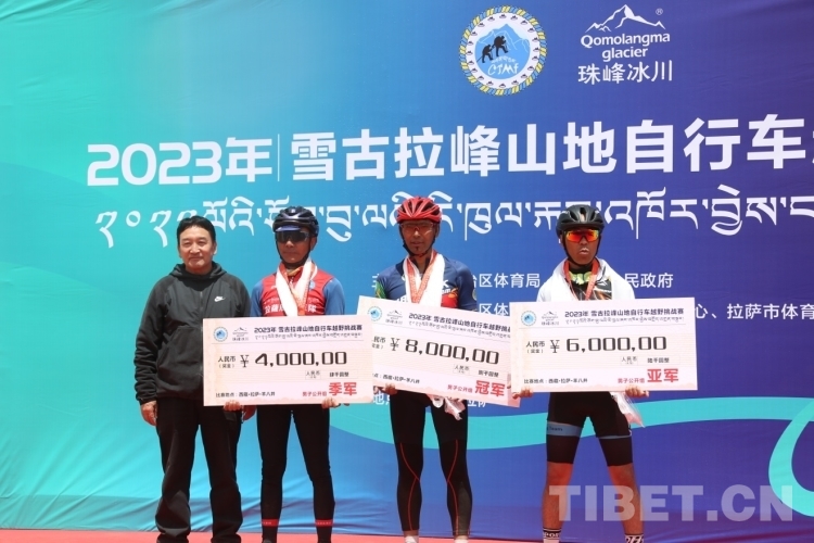 圖為獲得男子精英組冠軍西藏亞車隊(duì)選手江村羅布、亞軍西藏亞車隊(duì)扎頓、季軍拉薩朋友車隊(duì)選手索朗 攝影:德吉卓瑪