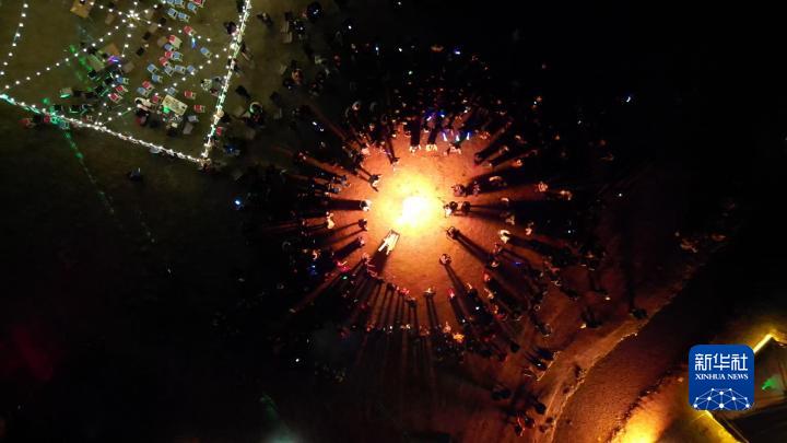 4月27日,游客們在“過林卡”現(xiàn)場跳起鍋莊舞,氣氛熱烈(無人機照片)。新華社記者聶毅 攝