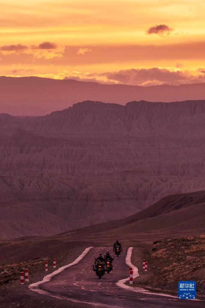 夕陽(yáng)時(shí)分,三位騎士駕駛摩托車駛向札達(dá)土林(5月25日攝)。新華社記者 費(fèi)茂華 攝