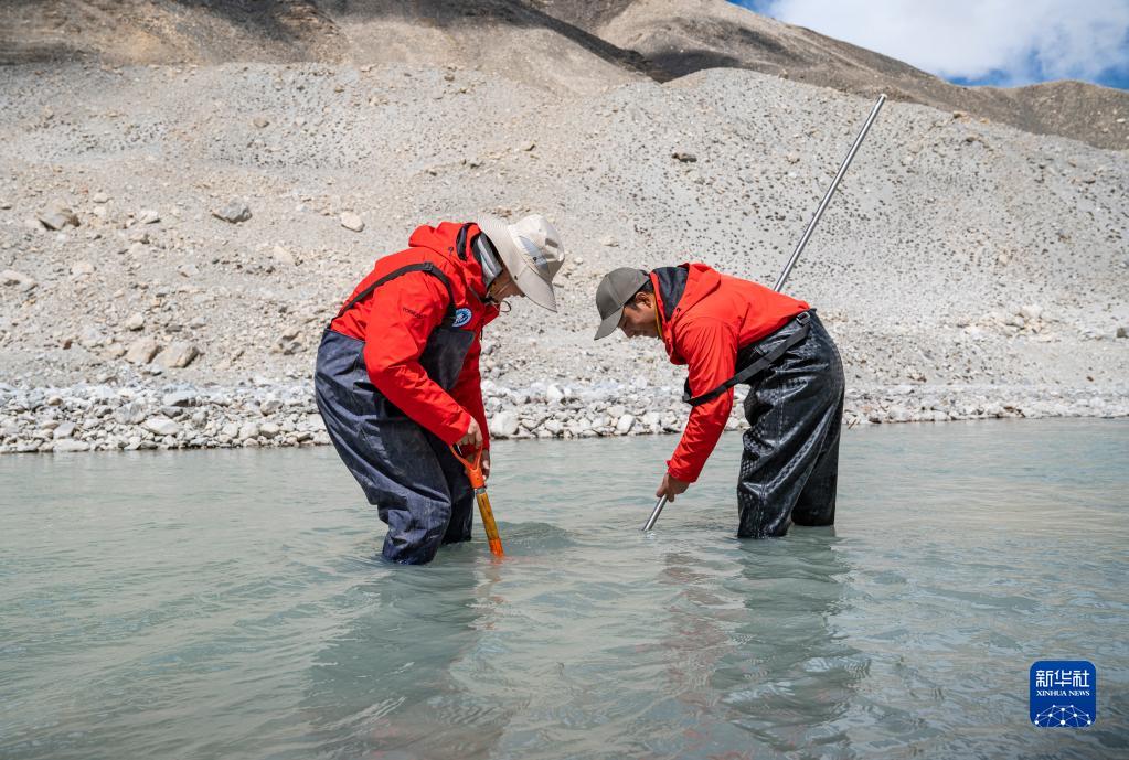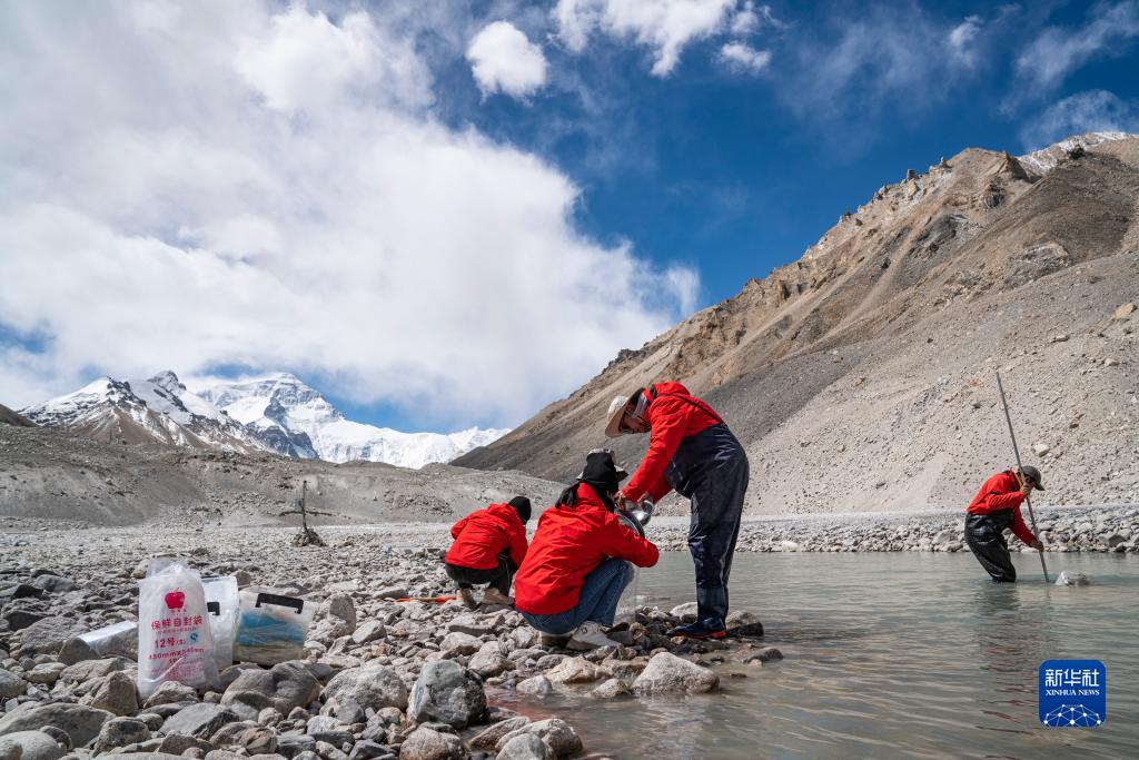在珠峰登山大本營附近,來自西藏大學(xué)生態(tài)環(huán)境學(xué)院的科考隊(duì)員在進(jìn)行水生態(tài)調(diào)查(5月22日攝)。新華社記者 孫非 攝