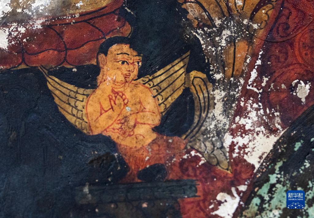 這是5月26日拍攝的皮央石窟壁畫中的長(zhǎng)翅膀的人物造型。新華社記者 費(fèi)茂華 攝