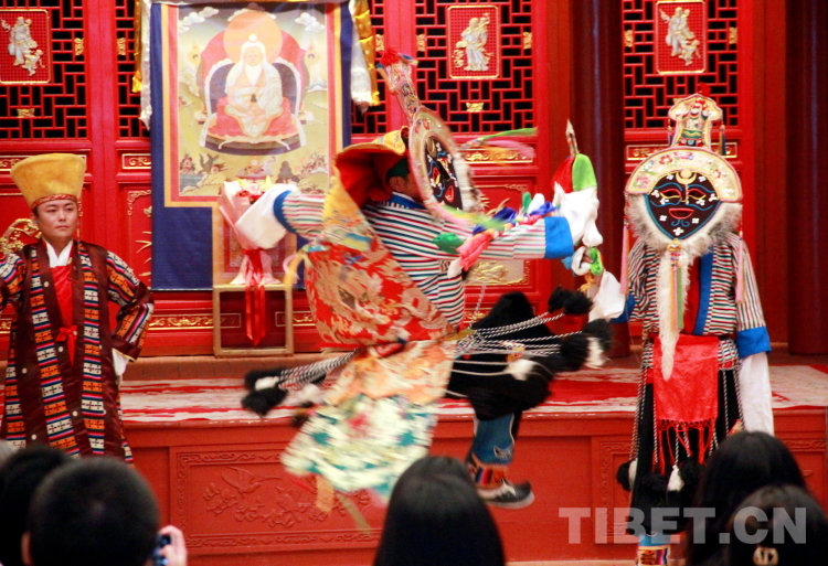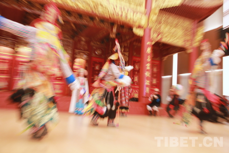 圖為拉薩市城關(guān)區(qū)娘熱民間藝術(shù)團演員表演國家級非物質(zhì)文化遺產(chǎn)“嘎爾”攝影:劉莉