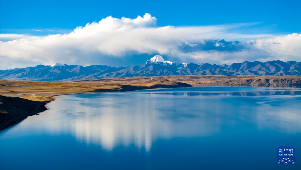 普蘭縣境內(nèi)的瑪旁雍錯(cuò),遠(yuǎn)處雪山為岡仁波齊(無(wú)人機(jī)照片,9月13日攝)。新華社記者 姜帆 攝